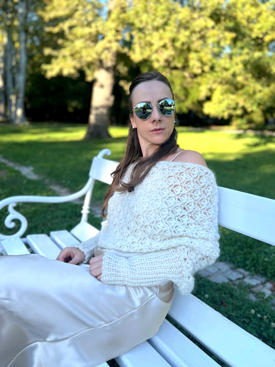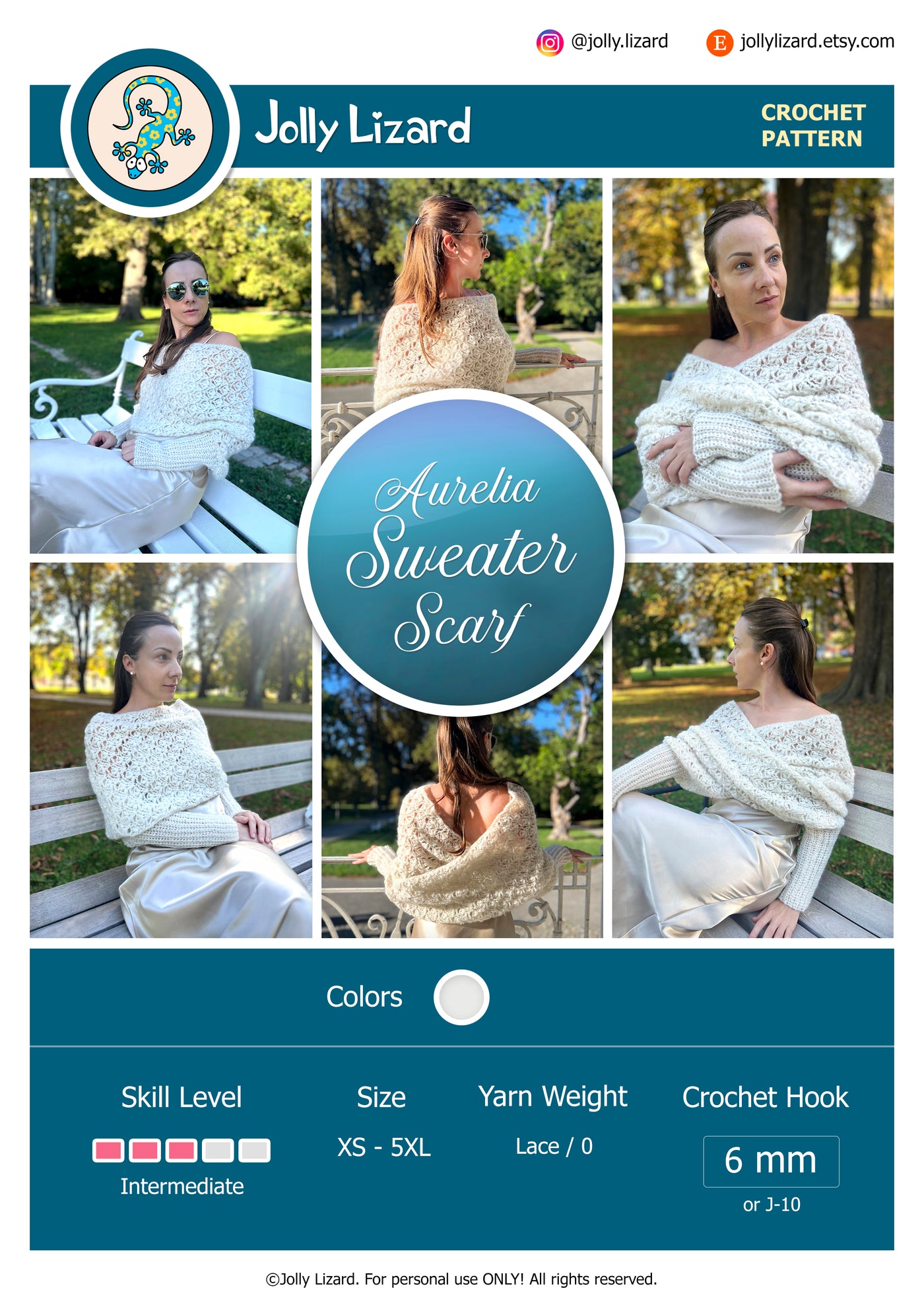 Crochet pattern for an elegant sweater-scarf with open sleeves and a soft, flowing drape. Worked in lace mohair for a light yet warm fabric, suited for intermediate crocheters and available in sizes XS–5XL.