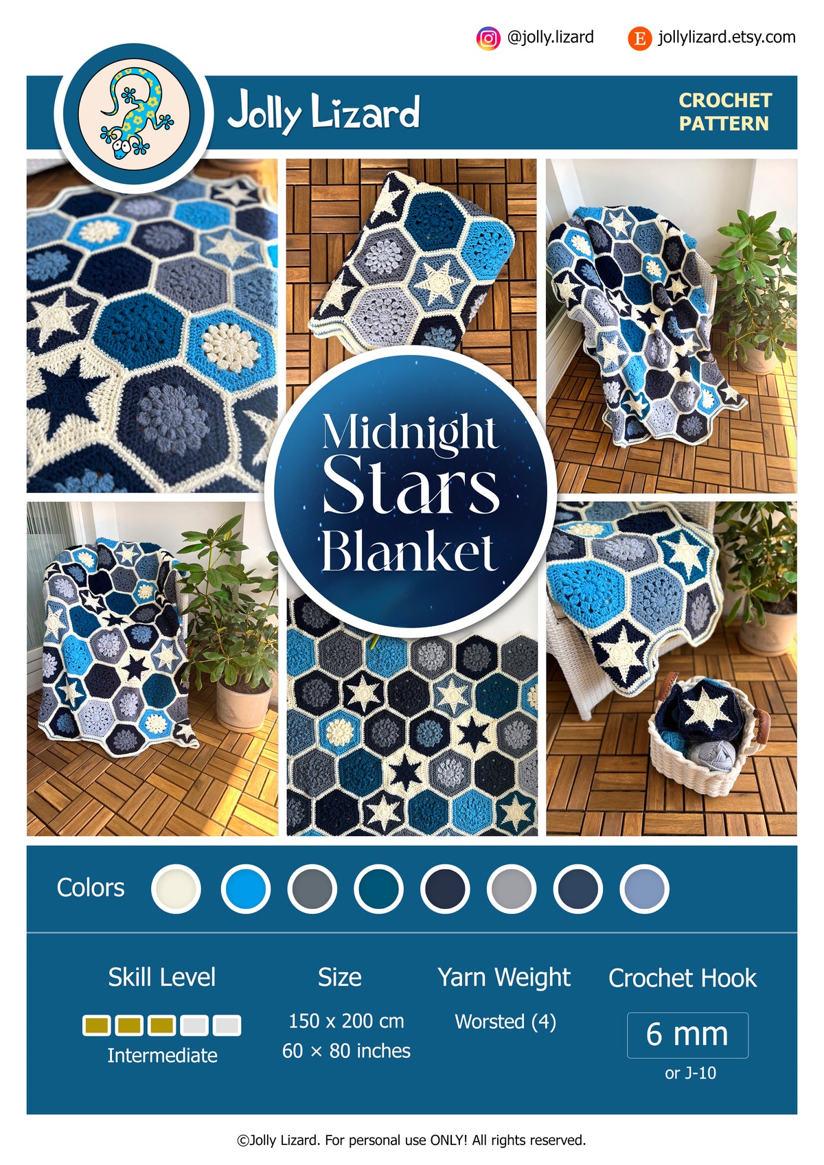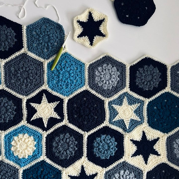 The Midnight Stars Blanket is a calming, meditative crochet project made from soft hexagon motifs that come together like a constellation in yarn. The gentle rhythm of the puff stitches and simple shaping make it a joy to work on - perfect for evenings, slow weekends, or any time you want a peaceful project with a magical finish.