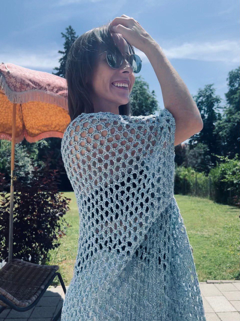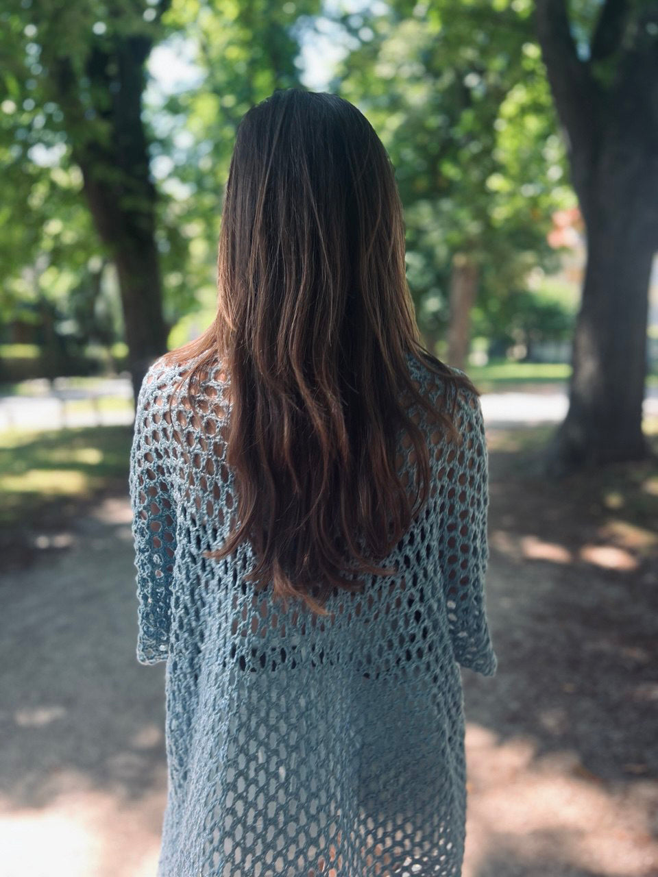 Crochet pattern for a light mesh cardigan made from two simple rectangles with a relaxed, flowing fit. An easy, airy layer perfect for summer and warm-weather outfits.