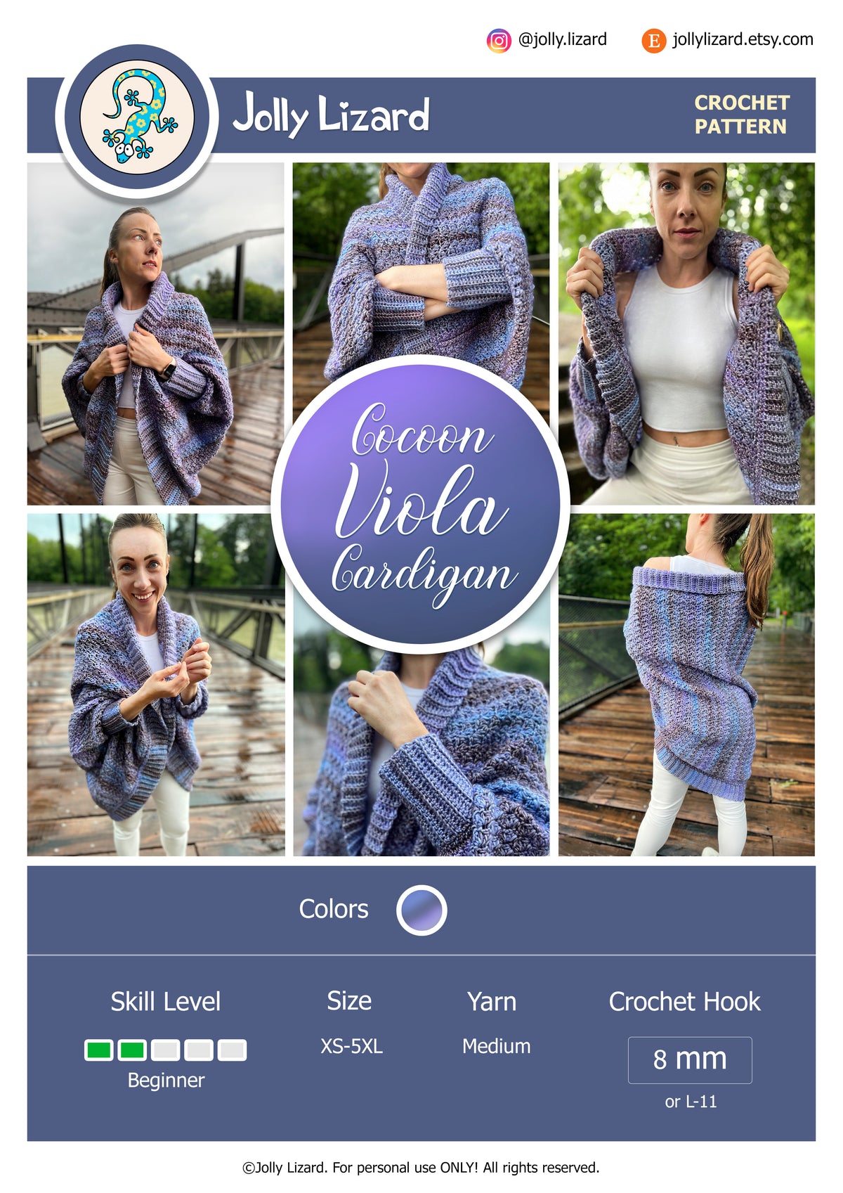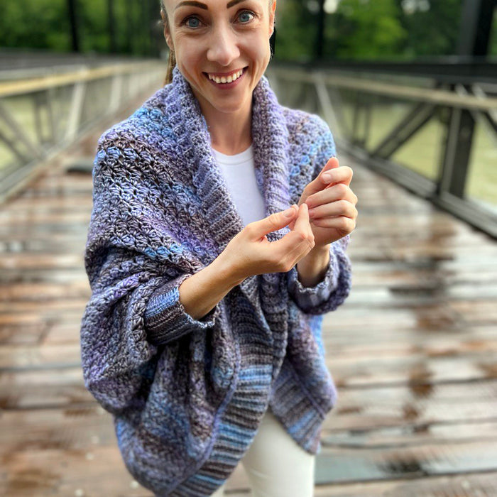 The Viola Cocoon Cardigan is a warm, textured crochet garment designed for comfort, style, and easy customization. Worked flat in one large piece and folded into shape, it uses modified sedge stitch to create a dense, cozy fabric that drapes beautifully and feels soft and substantial.